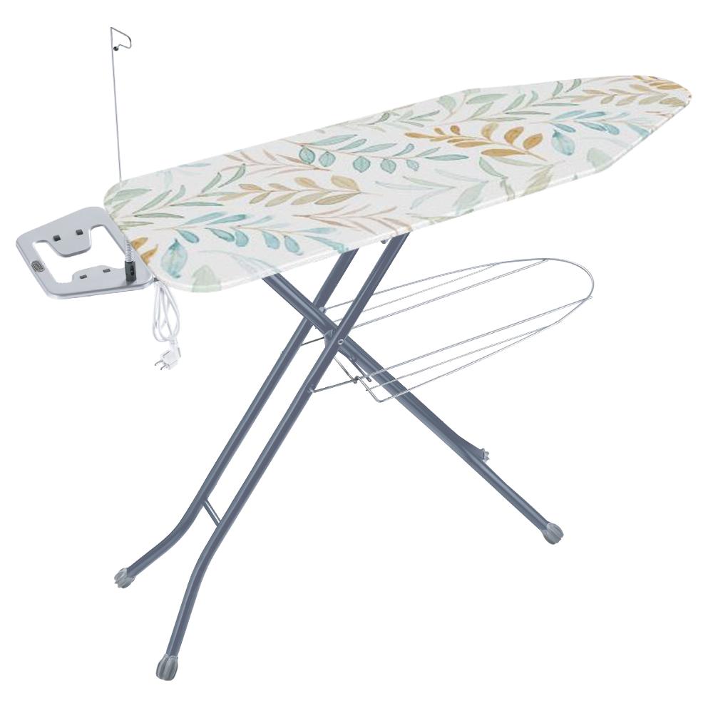 Deska do prasowania posiada regulację wysokości, podstawkę na żelazko z silikonowymi elementami zapobiegającymi uszkodzeniu powierzchni żelazka.