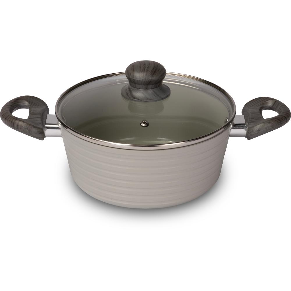 Wykonane z bardzo wytrzymałego aluminium. Naczynia wyposażone są w ceramiczną powierzchnię odporną na zarysowania i przypalanie, grube dno z bardzo eleganckimi uchwytami dla większego bezpieczeństwa, funkcjonalności i wygody. Pokrywka z wytrzymałego szkła i wylot pary dla precyzyjnej kontroli gotowania. Materiał ceramiczny jest bardzo odporny na ciepło, zapobiega przypiekaniu się potraw, zdrowe gotowanie. Łatwa konserwacja i czyszczenie.
