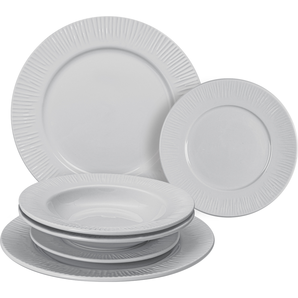 Zestaw talerzy zawiera 2 płytkie talerze, 2 głębokie talerze i 2 talerze deserowe.
