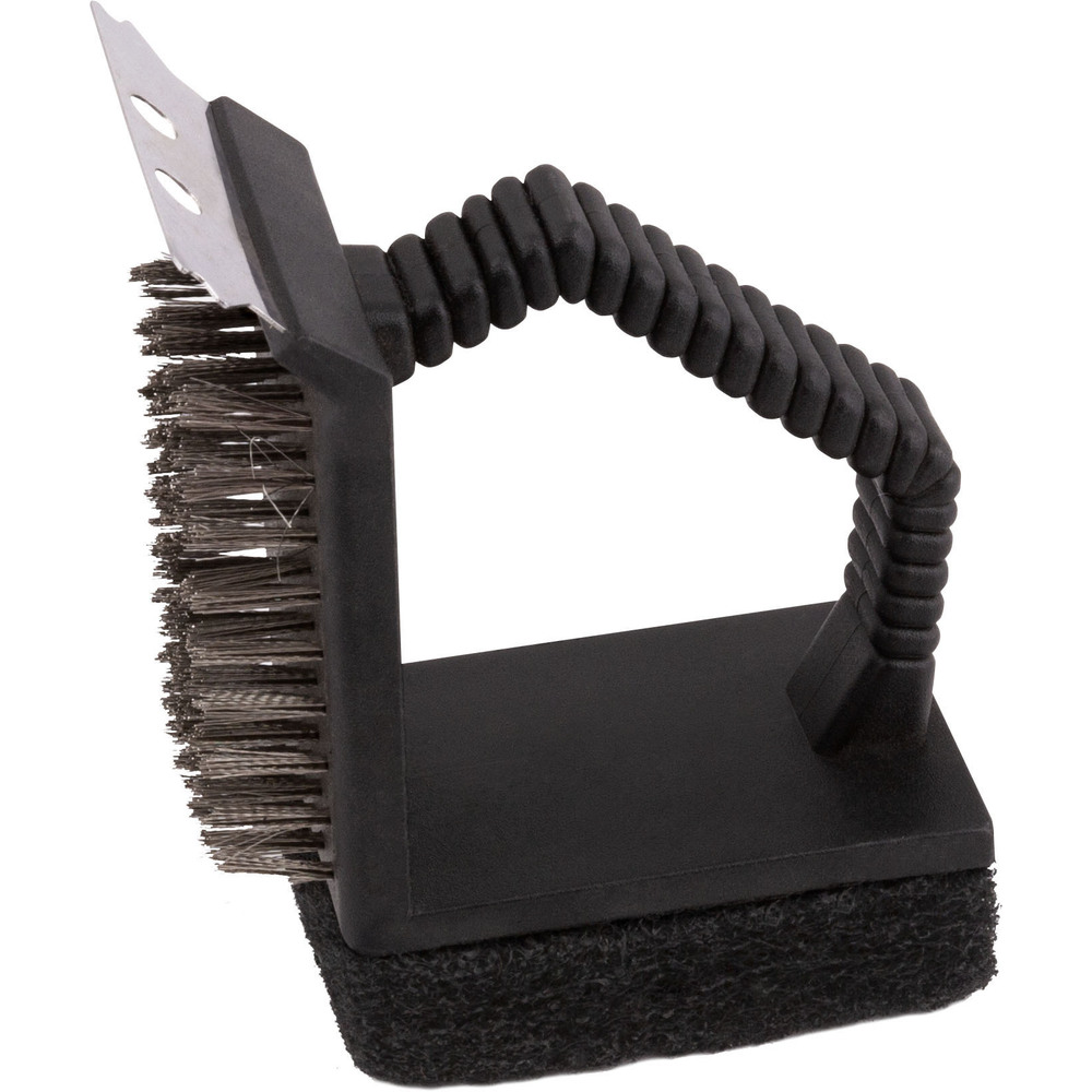 Szczotka do grilla posiada stalowe włosie, nierdzewny drapak i stalową gąbkę z plastikowym uchwytem do wygodnego trzymania w ręku.